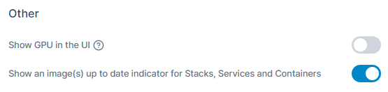 Toggle on to enable GPU assignments in the Portainer UI. This adds additional processing to the container and stack listing pages, so if you are not using GPUs on your environment we recommend toggling this off.