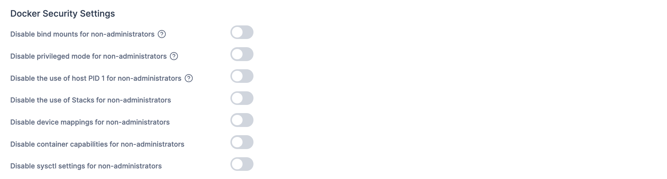 This section allows you to toggle assorted Docker-related security settings for the environment.
