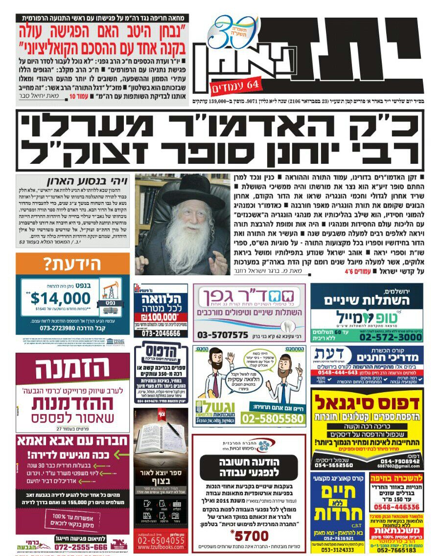 אין טענות לעיתונות הישראלית, שלא מצאו לנכון לתת איזכור בשער מה שב"יתד נאמן" כותרת ראשית. רק אל תבואו בטענות הפוכות.pic.twitter.com/Ds5LNVuk2k