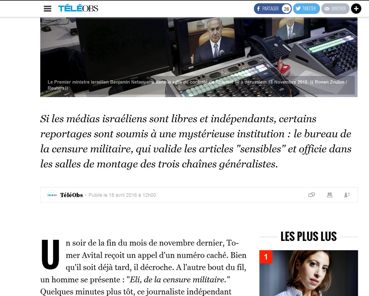 34. כתבה במגזין צרפתי על הצנזורה הישראלית ועיתונאים עצמאיים - בעקבות השיחה שחשפנו בערוץ 10