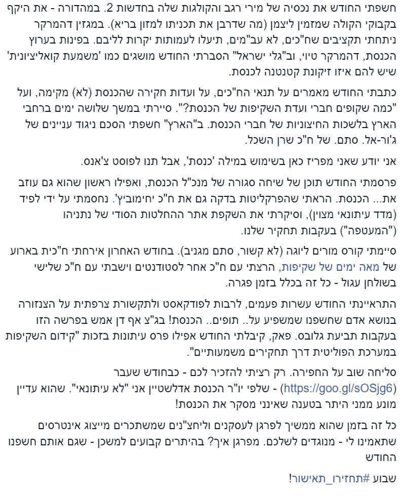 25. תומר אביטל מכריח את הכנסת לחשוף חלק מרשימת האישורים הקבועים. עוד שלב בדרך לשכנע את הממסד שהמדע שלנו ולא של אמא שלו