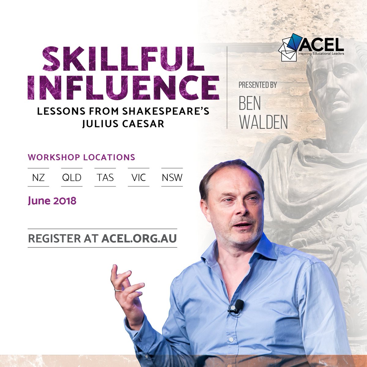 @acelaustralia is proud to welcome back Ben Walden as he presents his unique leadership workshops across Aus & NZ - "Skillful Influence : Lessons from Shakespeare's Julius Caesar" Coming this June. Registrations are now open. http://www.acel.org.au/ACEL/ACELWEB/Events/2018/Skilful_Influence/About.aspx …pic.twitter.com/XnoGLmDX5R