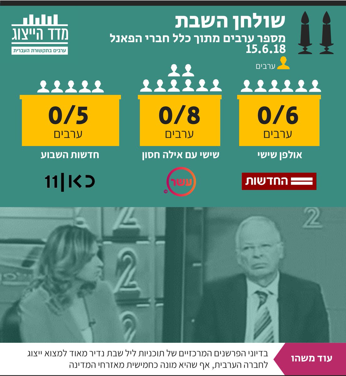 בפאנלים של שישי בערב - אין כניסה לערבים. חלפו 32 שבועות רצופים מאז הפעם האחרונה שהופיע אזרח ערבי בפאנלים של 3 תוכניות האקטואליה המרכזיות המשודרות בימי שישי בערב: "אולפן שישי" של , "שישי עם אילה חסון" של או "חדשות השבוע" של . מתי יישבר הרצף?