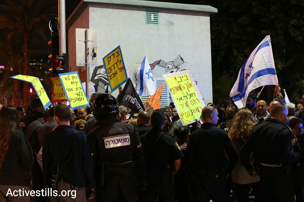 Pic: Activist stands with a sing next to masked Israeli.policemen during anti