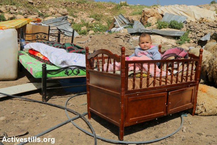TODAY: A Palestinian baby sits in his crib in Khirbet Tana, which was demolished by Israeli forces, east of