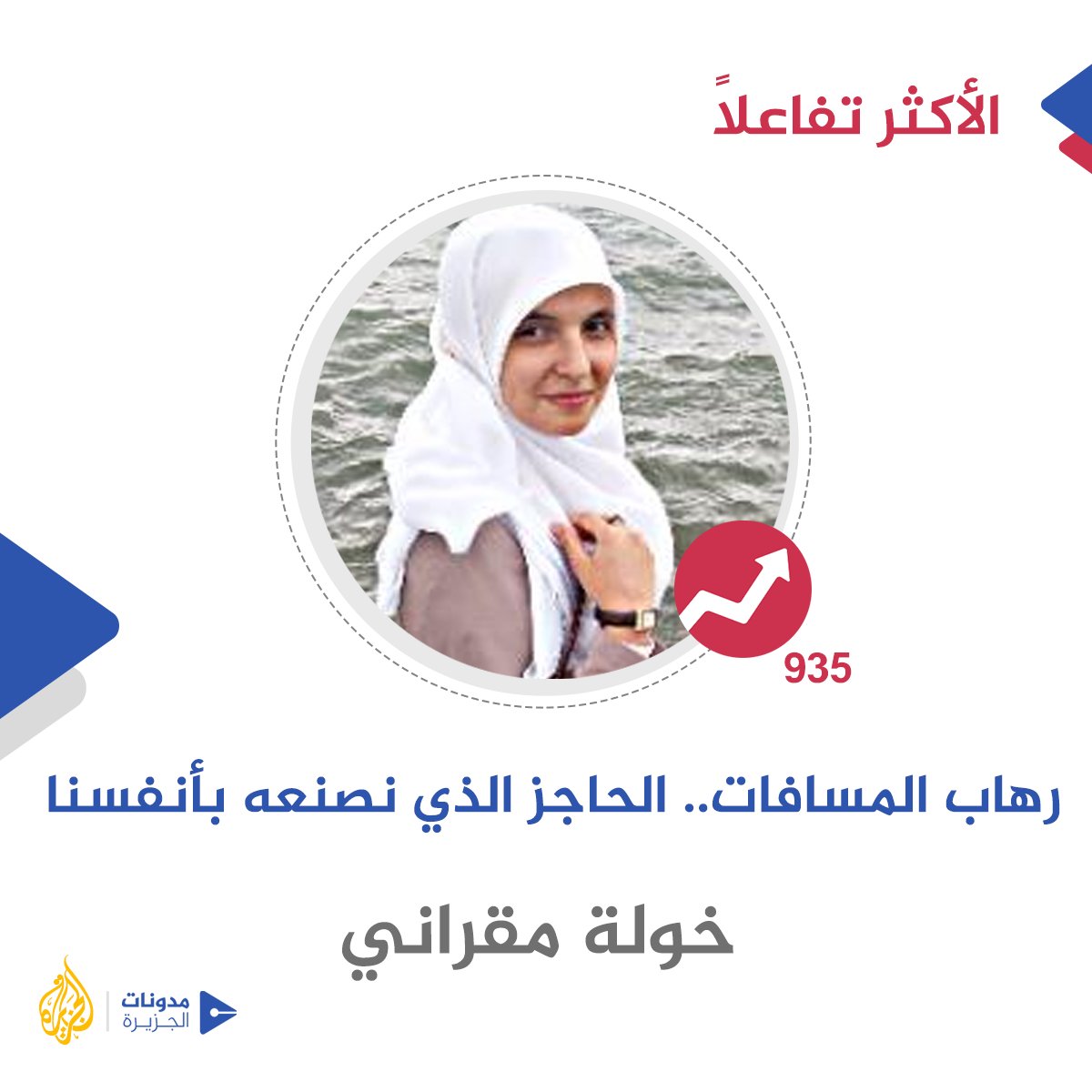 #الأكثر_تفاعلا على#مدونات_الجزيرة بالأمس "رهاب المسافات.. الحاجز الذي نصنعه بأنفسنا!" للمدونة الجزائرية "خولة مقراني"@mokranikhawla1 لقراءة التدوينة: http://bit.ly/2zpqdmr pic.twitter.com/SyM73K7AAo