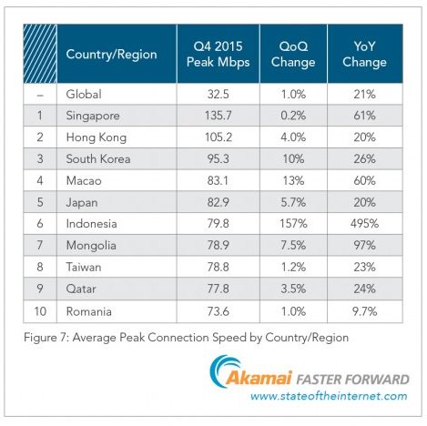 Singapore had the highest avg peak connection speed during Q4 at 135.7 Mbps http://akamai.me/1qjONfc