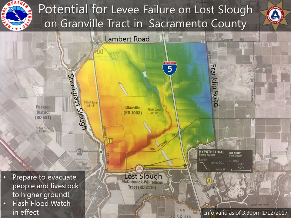 18. Levee failure possible on Lost Slough in Sac Co. Prepare to evacuate people & livestock in Granville Tract.