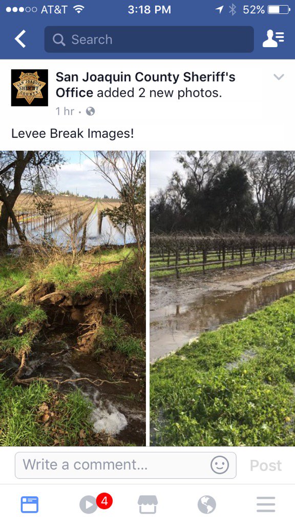 6. Levee break in White Slough State Wildlife Area, near Lodi treatment plant off I-5. No threat to other areas, careful if walking in area.