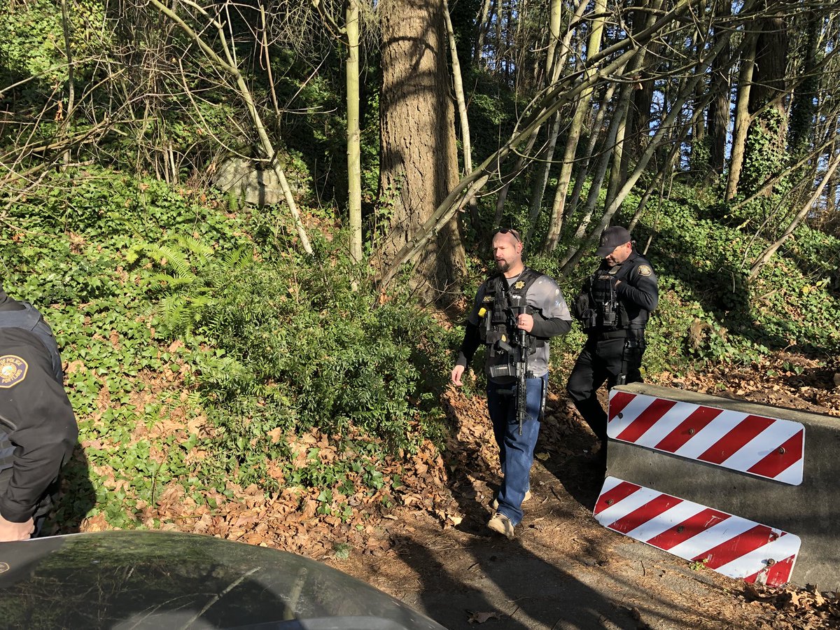Portland police officers leave a wooded hillside at Rocky Butte where they were looking for a suspect. Officers would not confirm the suspect may be connected with a Sauvie Island shooting incident.