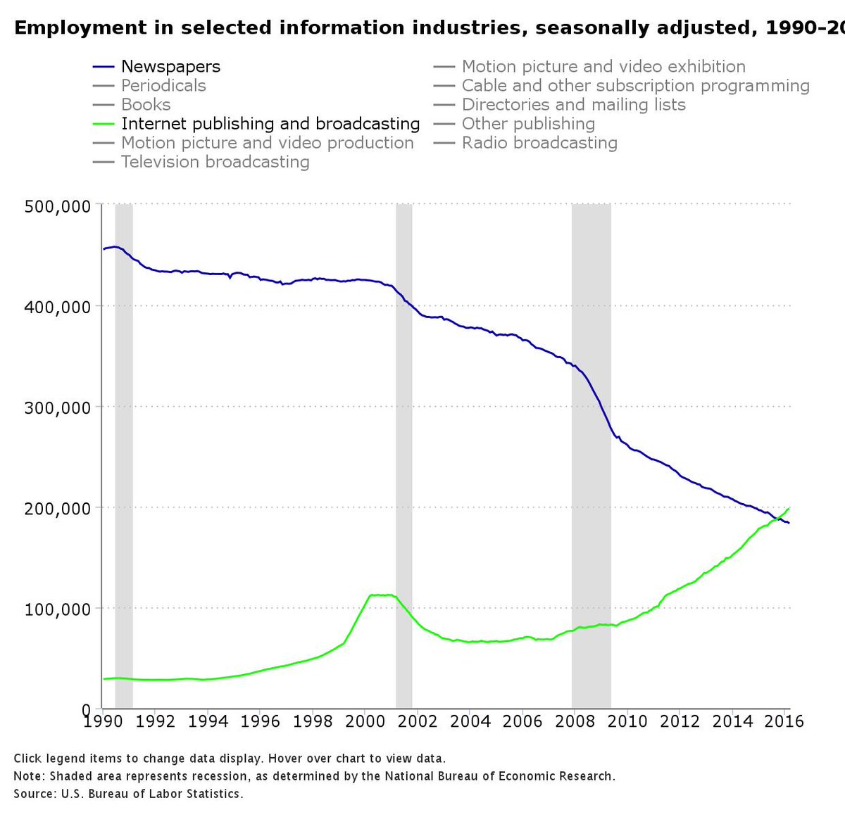 2. "Employment at online outlets first eclipsed newspapers in October 2015." via