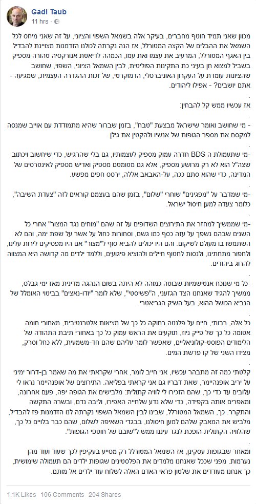 גדי טאוב. אז הנה נקרתה לכולנו הזדמנות מצויינת להבדיל בין האגף המטורלל, המרעיב את עצמו ואת עמו, הכמהה לדיאטת אנורקסיה טהורה מספיק בשביל למצוא חן בעיני כת התקינות הפוליטית, לבין השמאל הציוני, השפוי, שחושב שהציונות עומדת על העקרון האוניברסלי, הדמוקרטי, ... https://www.facebook.com/story.php?story_fbid=10155610030817151&id=535342150 …pic.twitter.com/54VLf75ZZ7