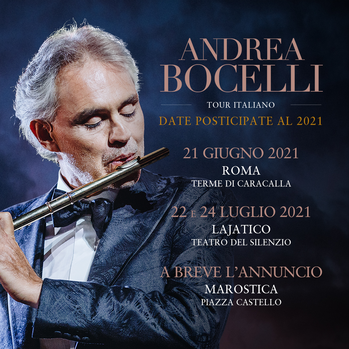 13. n ottemperanza alle disposizioni governative vigenti (decreto Legge n.33 del 16 maggio 2020), i tre grandi eventi dal vivo di Andrea Bocelli previsti per i prossimi mesi in Italia verranno posticipati. Per i dettagli relativi alle singole date: