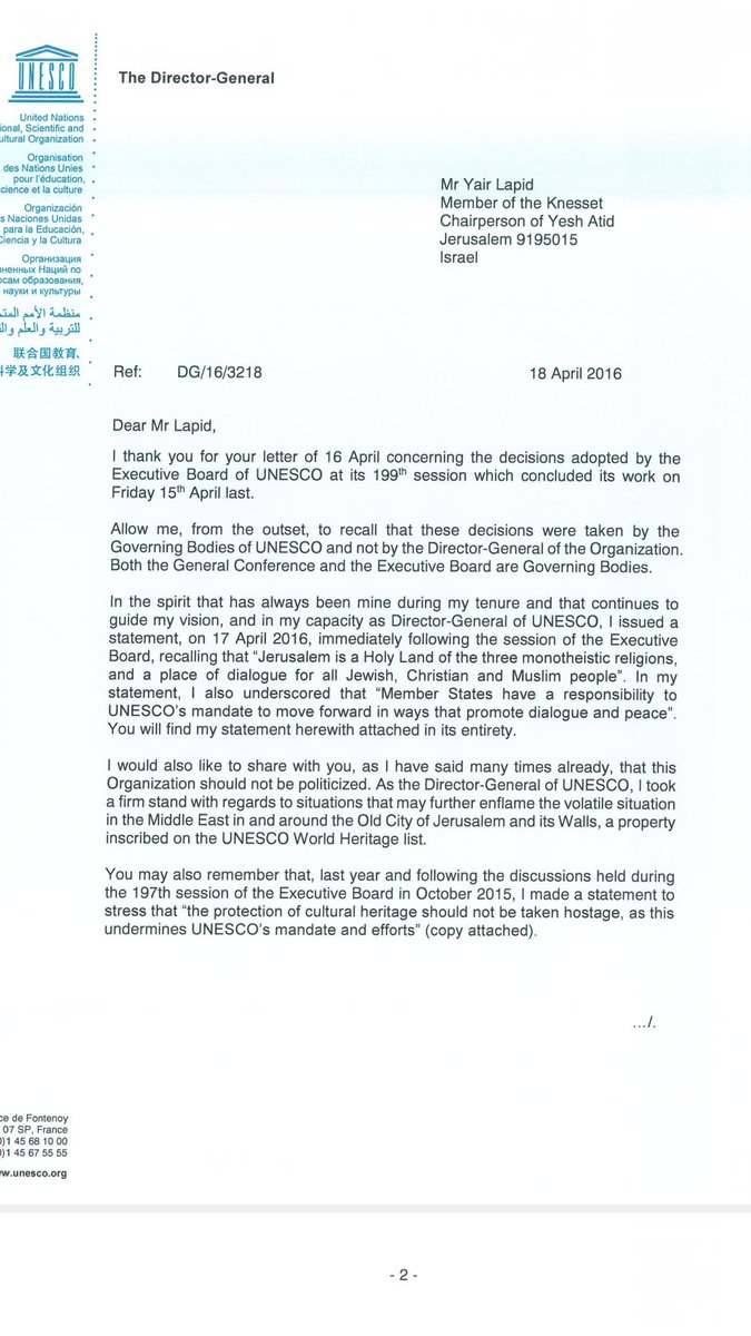 בניגוד לדבריו של יאיר לפיד מנכ"לית אונסק"ו לא ממש הודתה בטעות. למעשה היא טענה שהוא טעה בכתובת כששלח אליה מכתב תלונהpic.twitter.com/kq32rKRfHg