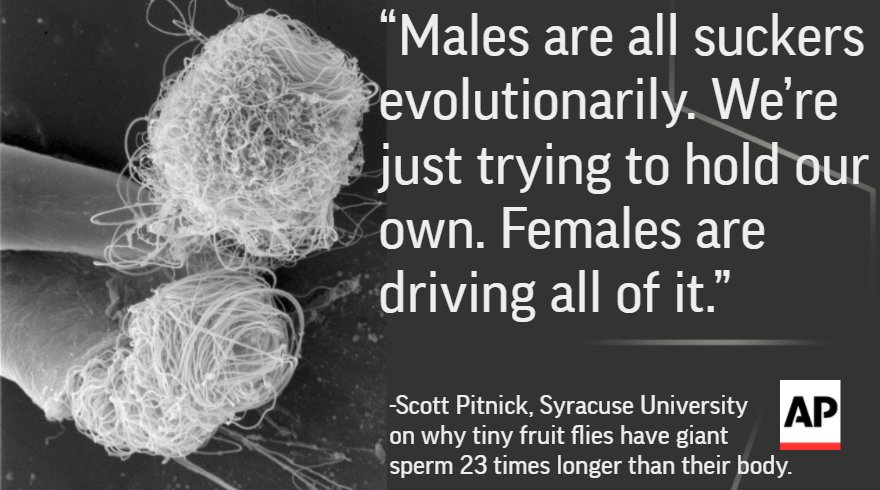 12. Tiny fruit flies have giant sperm (1100X longer than human sperm). Why? Size matters to her.
