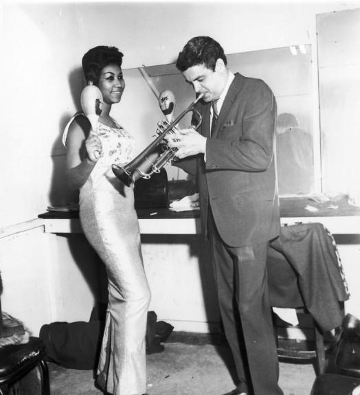 14. . backstage jamming, with maracas and all, with trumpeter Maynard Ferguson