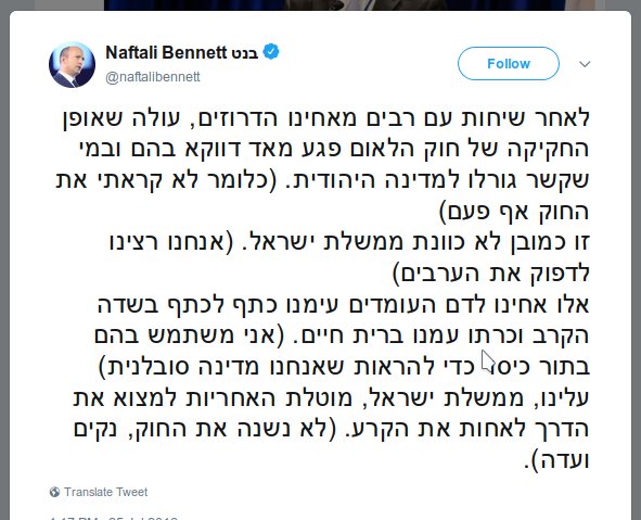 אם יש לכם חברים דרוזים, בפייס או בכלל, כדאי לעקוב אחרי התחושות הקשות, כולל של הפטריוטים ביותר, בעקבות חוק הלאום. היה מרחב של שיויון על הנייר שהם יכלו להתקיים בתוכו והוא הוחלף באי נוחות עמוקה. החוק התאפשר גם בגלל חוסר הפופולאריות של המיעוט הערבי ונציגיו . הדרוזים סיפור אחר כידוע