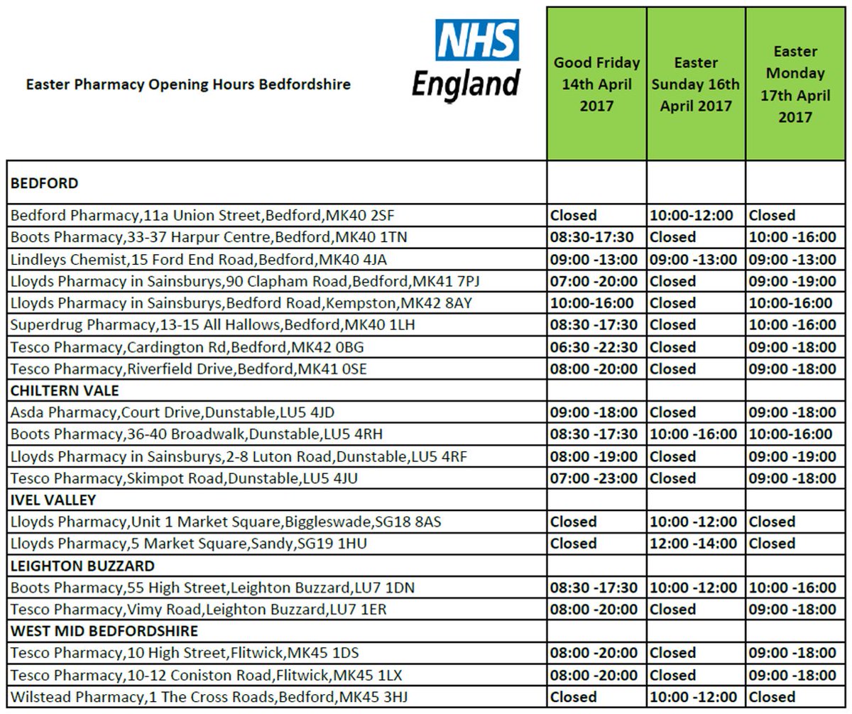 Here are the pharmacy opening times for Bedfordshire over the Easter weekend.pic.twitter.com/W6KbUDSXY6
