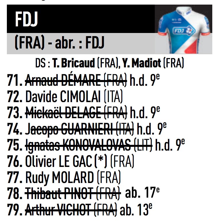 C'est l'hécatombe à la FDJ ! Après l'abandon de Thibaut Pinot, l'équipe n'est composée que de... 3 coureurs. http://ow.ly/uSgs30dL44T pic.twitter.com/JKUK99Pps4