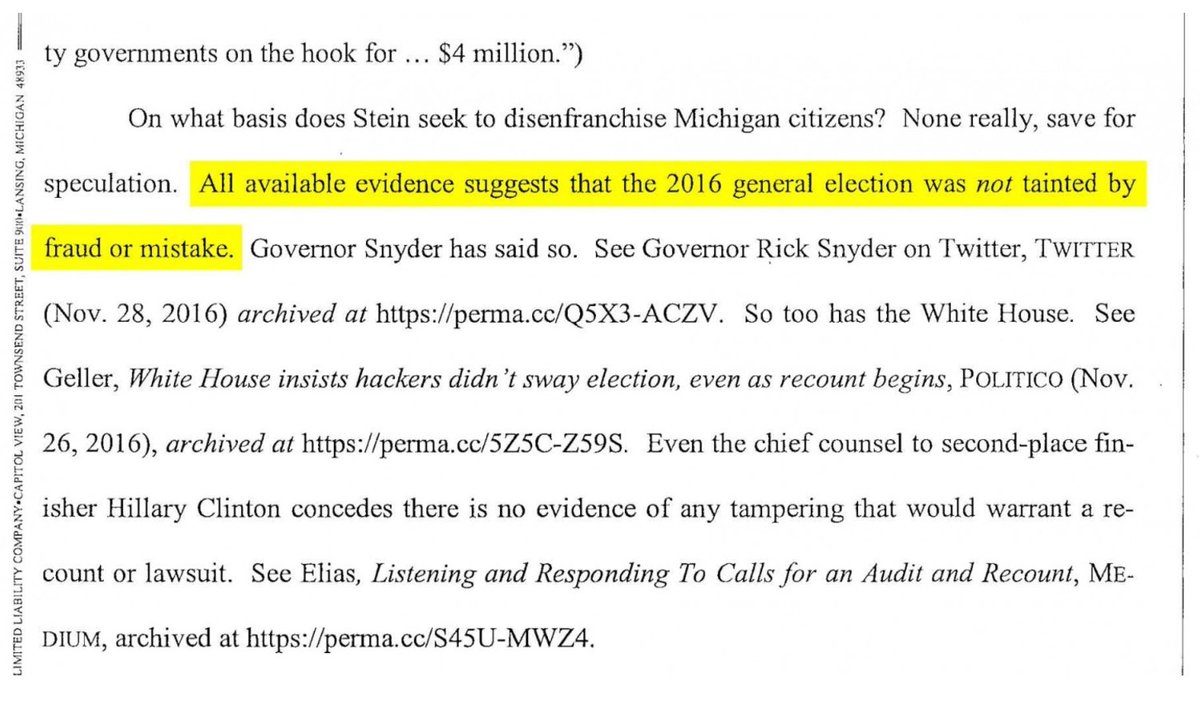 3. Trump's own attorneys in a legal filing: “All available evidence suggests that the 2016 general election was not tainted by fraud...”pic.twitter.com/gZ8Aut84N2