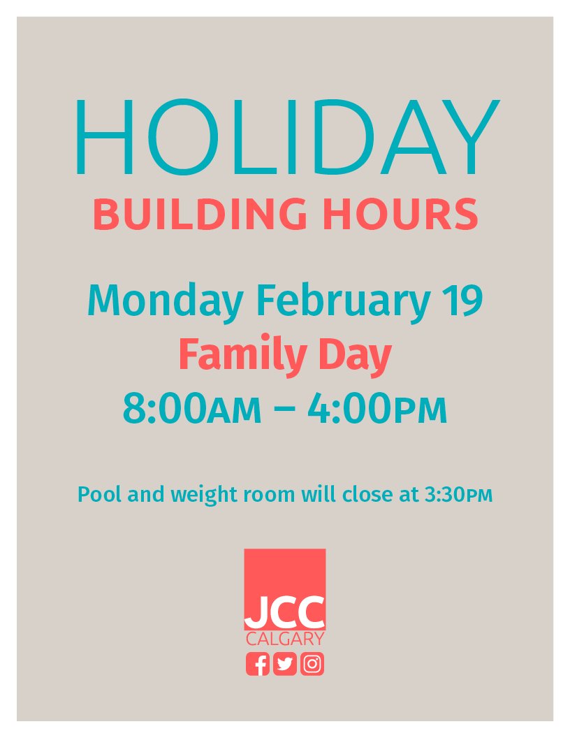 Please note that we will be open from 8am-4pm on Monday February 19 for Family Day. The pool and weight room will close at 3:30pm. Enjoy your time with family and friends!pic.twitter.com/XVcodZhlp6