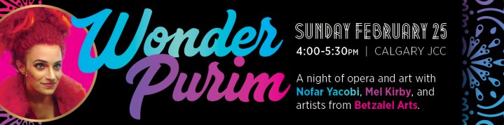 Wondering what our Wonder Purim event on Feb 25 at 4pm is all about? Enjoy a medley of Purim songs with Verdi, Mozart, Bernstein, & Copland. Browse the art wall of Betzalel Arts’ works & relax with refreshments. Buy your tix at 403-253-8600, ext. 0. http://bit.ly/2o4QL3G pic.twitter.com/sfddfRokH9