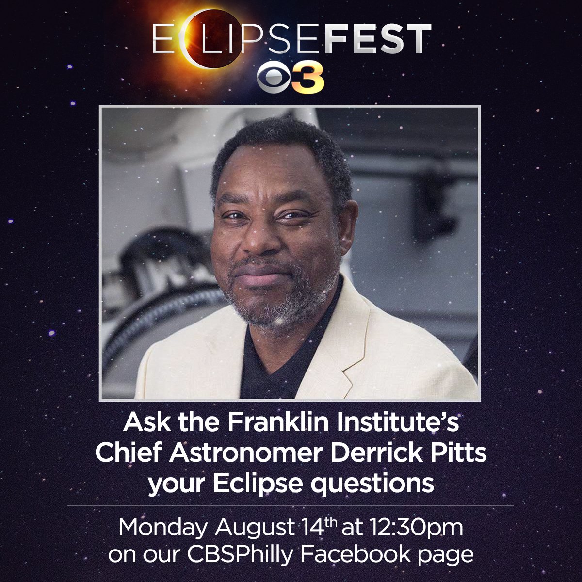 @TheFranklin's Chief Astronomer Derrick Pitts (@CoolAstronomer) your#Eclipse2017 questions! http://bit.ly/2wQUFQB pic.twitter.com/nxw2hQsWk6