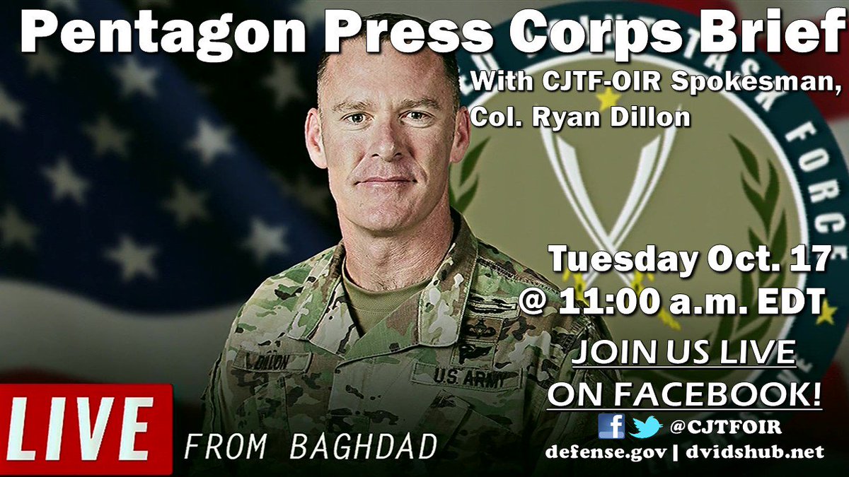 #CJTFOIR Spokesman Col Ryan Dillon updating Pentagon Press Corps on ops in#Iraq &#Syria Tues at 11 am EDTpic.twitter.com/2TcmbnFIHT