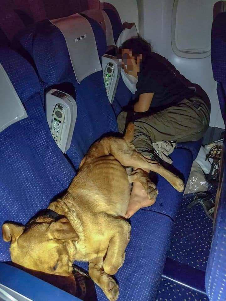 Un soldat de notre unité K-9 et son chien de sauvetage prennent un repos bien mérité lors du vol de retour de la mission d'aide humanitaire