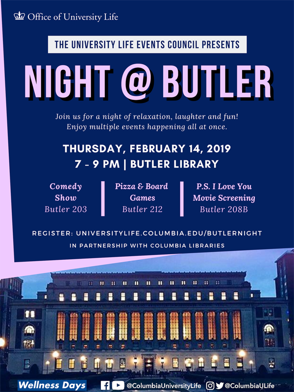 @ColumbiaULife kicks off their annual Wellness Days on Mon. 2/11 w/ fitness classes, daily study breaks, meditation sessions & more. Check out the schedule of events: http://universitylife.columbia.edu/wellness-days-columbia-schedule … Pencil in our Night @ Butler on Thurs. 2/14 for a comedy show & a movie (& FREE