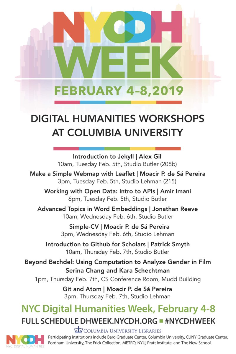 #NYCDHWeek comes to@Columbia w/ a series of workshops on open data, web mapping & other topics in#digitalhumanities, Tues. 2/5 - Thurs. 2/7. For more details & to register, visit: http://dhweek.nycdh.org pic.twitter.com/r2uSIHh80K