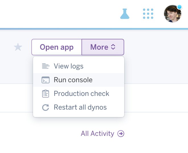 Have you ever tried the Heroku Console in the browser? It's like doing `heroku run` (`bash` etc) but from the web. So cool!!! :D