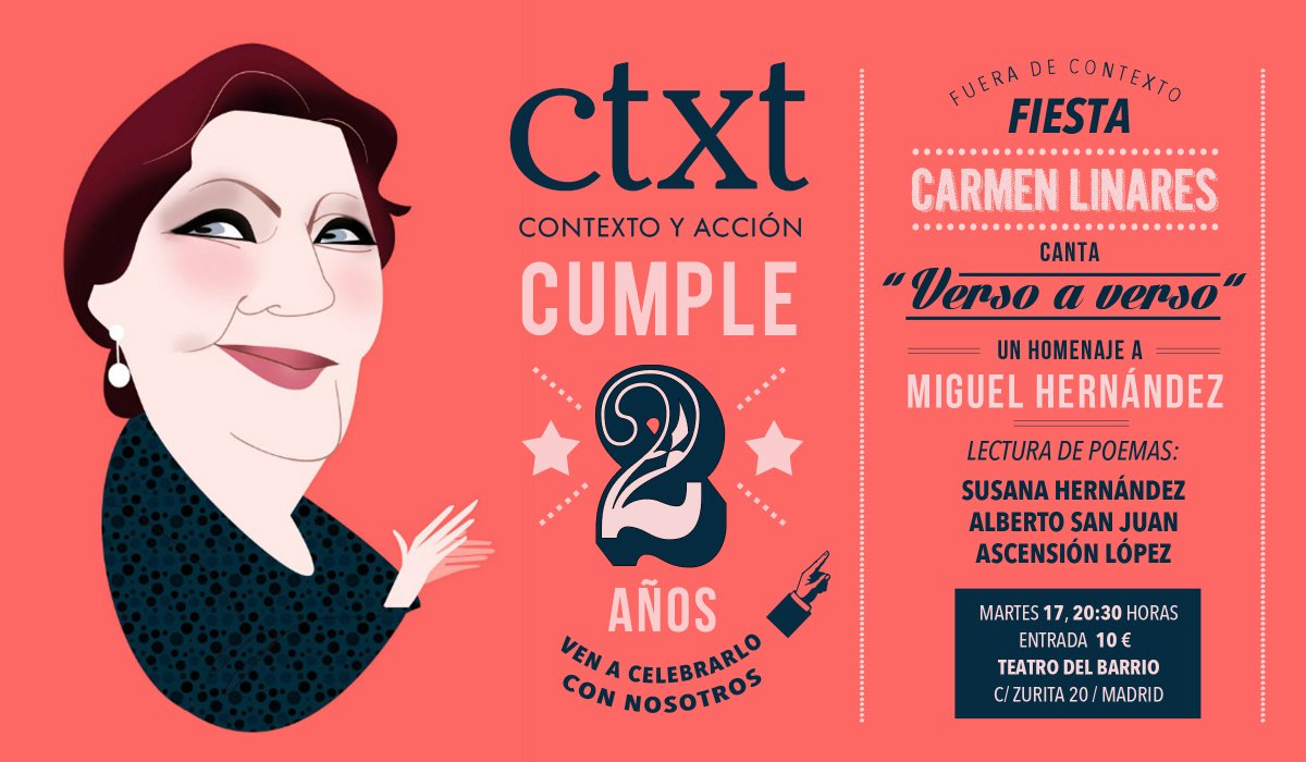 9. Mañana, fiesta de CTXT en el Teatro del Barrio: Carmen Linares canta por Miguel Hernández. Y tenemos cinco entradas de sobra.