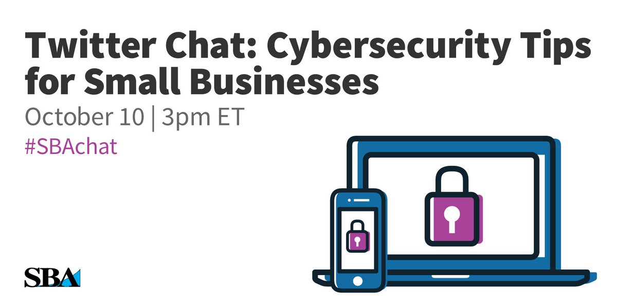 #SBAChat in honor of#CyberAware Month:#Cybersecurity tips for small businesses, Oct. 10, 3 p.m. EDT.pic.twitter.com/jC7hH2OvCS