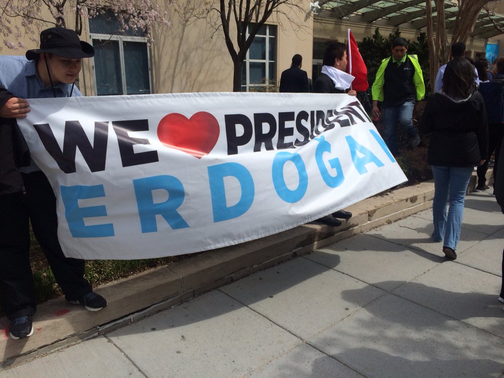 Things much calmer. Seems to be three groups of protestors. Anti erdogan: Ataturk society of America. Dc Kurds. Pro eragon group.