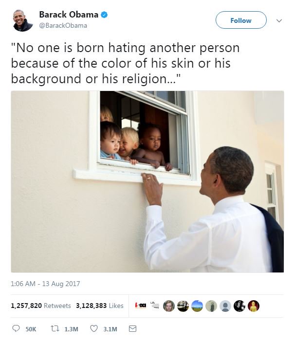 Tolerance defeats intolerance on Twitter... must be seething that is more popular on Twitter and as president