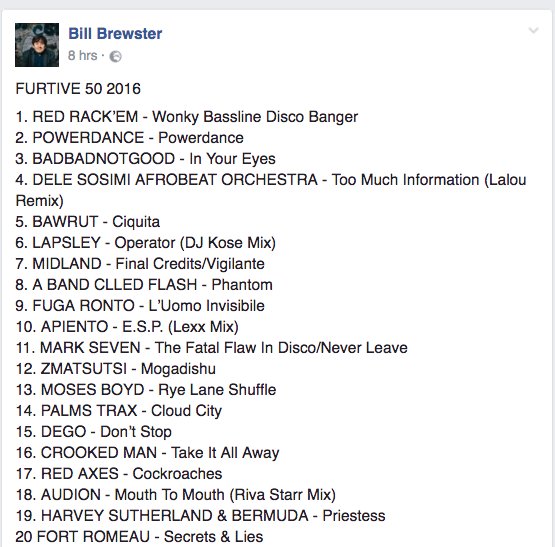 14. FURTIVE 50 2016 1. RED RACK’EM - Wonky Bassline Disco Banger 2. POWERDANCE - Powerdance 3. BADBADNOTGOOD - In...