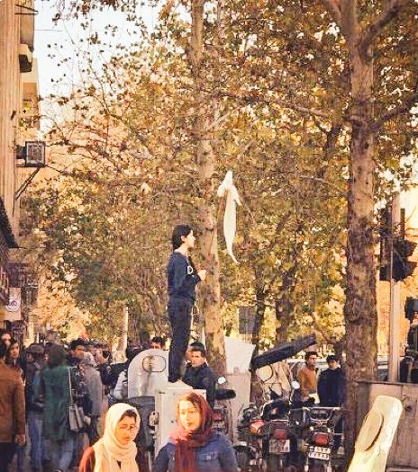 A young Iranian girl is beaten in the public by the government forces for not sufficiently covering her hair with hijab.