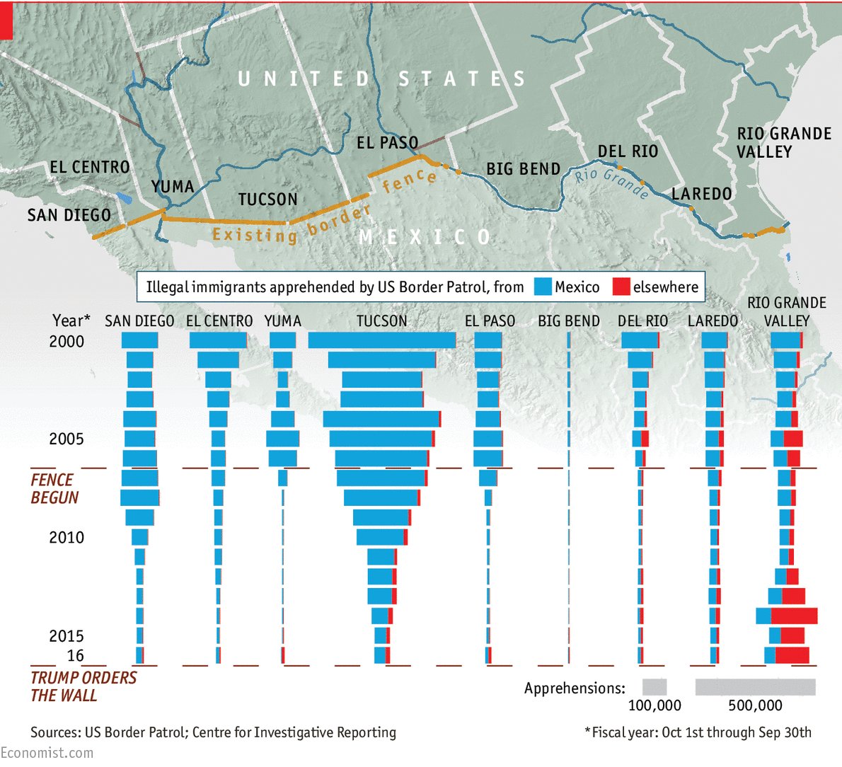 As Donald Trump orders a wall, fewer and fewer people are arrested at the US-Mexico border http://econ.st/2jWmrWx pic.twitter.com/2kghgSUmx2