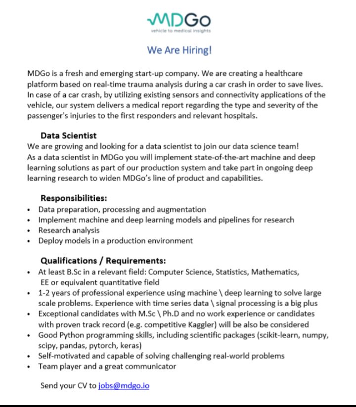 בטוויטר כולם חכמים - עזרו לי לזכות בחופשה :) מחפשים במשרד שלנו בחיפה Data scientist תותח/ית על עם ניסיון של שנתיים, או Ph.d בלי ניסיון. חברה מדהימה שהולכת להציל הרבה חיים בתאונות דרכים. הפיצו את הבשורהההpic.twitter.com/GxODnzYPje