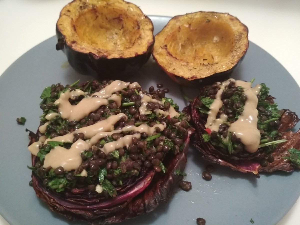 דלעת ערמונים ו'סטייק' כרוב עם צ'ימיצ'ורי עדשים שחורות וטחינה מתוקה. שבת שלום :)pic.twitter.com/xCNFmb4QB4
