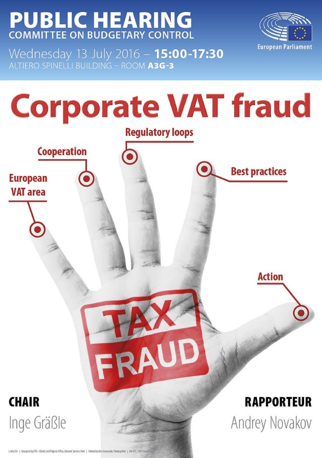 @EP_BudgControl TODAY Hearing on Corporate#VATfraud 15.-17@AndreyNovakov, programme: https://polcms.secure.europarl.europa.eu/cmsdata/upload/d578f262-d08b-4b47-a3eb-2215079394b9/2016-07-06%20Final%20programme%20-%20Hearing%20on%20Corporate%20VAT%20fraud%20-%2013%20July%202016.pdf …pic.twitter.com/Jr2s3Bsj9i