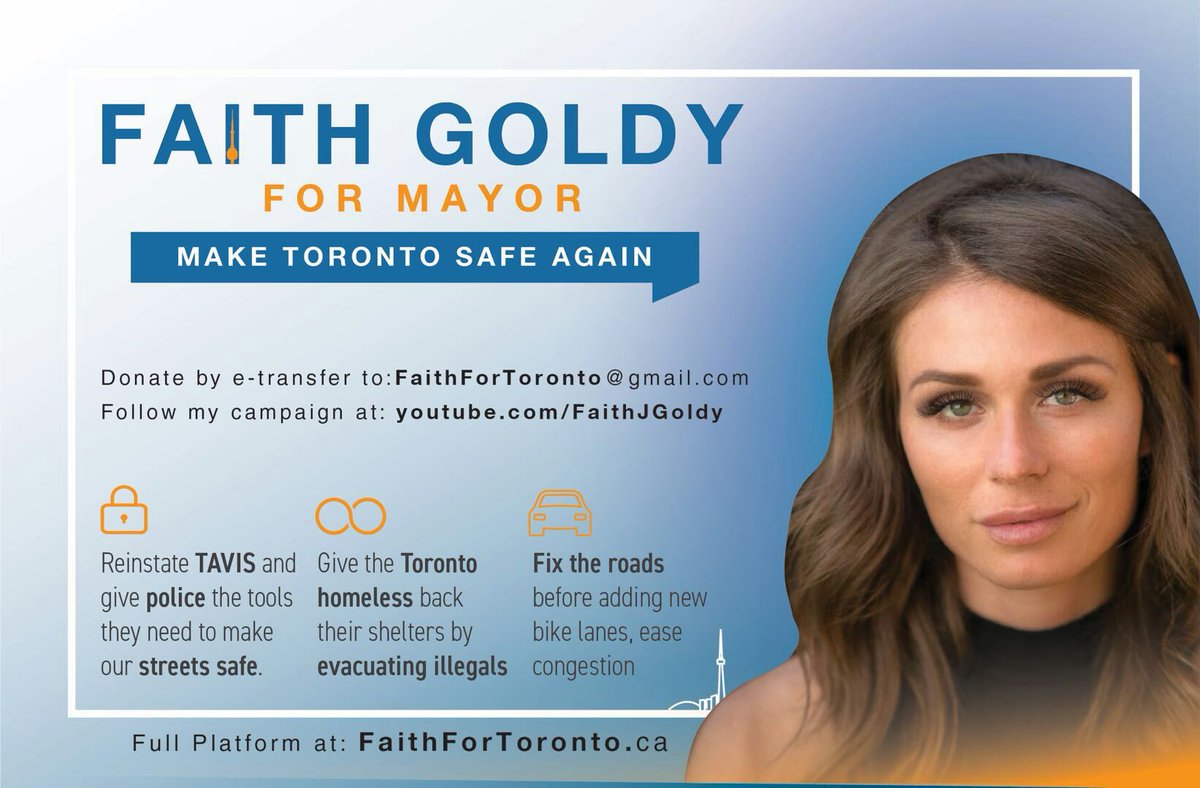 @FaithGoldy for Mayor of Toronto. Maybe, just maybe she will bring back democracy to municipal elections.pic.twitter.com/5oJtDBFCjS