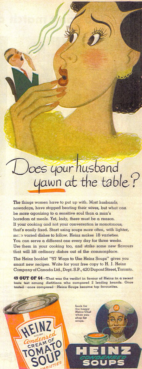 'Most men, nowadays, have stopped beating their wives'. Line in a 1950 advert for Heinz soups http://tinyurl.com/y6wfjwov pic.twitter.com/qYukiEaEAT