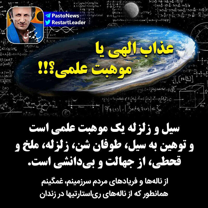 🔴لیدر ری استارت: سیل و زلزله یه موهبت علمی است و توهین به سیل،طوفان شن، زلزله، ملخ و قحطی، از جهالت و بی دانشی است. از ناله ها و فریادهای مردم سرزمینم، غمگینم همانطورکه از ناله های ری استارتیها در زندان تحریم ها با شدت خواهد آمد و ارتش ری استارت نیز ..هم!