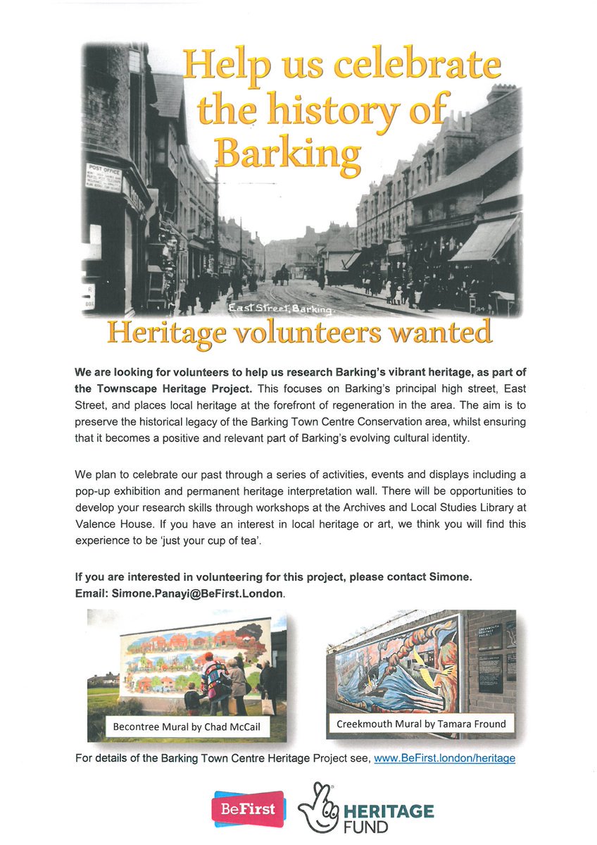 Heritage volunteers wanted! The Townscape Heritage Project will explore the rich history of East Street, Barking to preserve the historical legacy of the town. Opportunities to work in the archive here at Valence House and participate in creation of displays and a new mural.pic.twitter.com/T1JVJDzjZ8