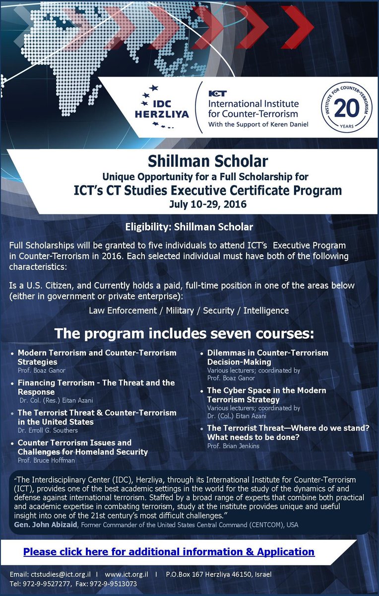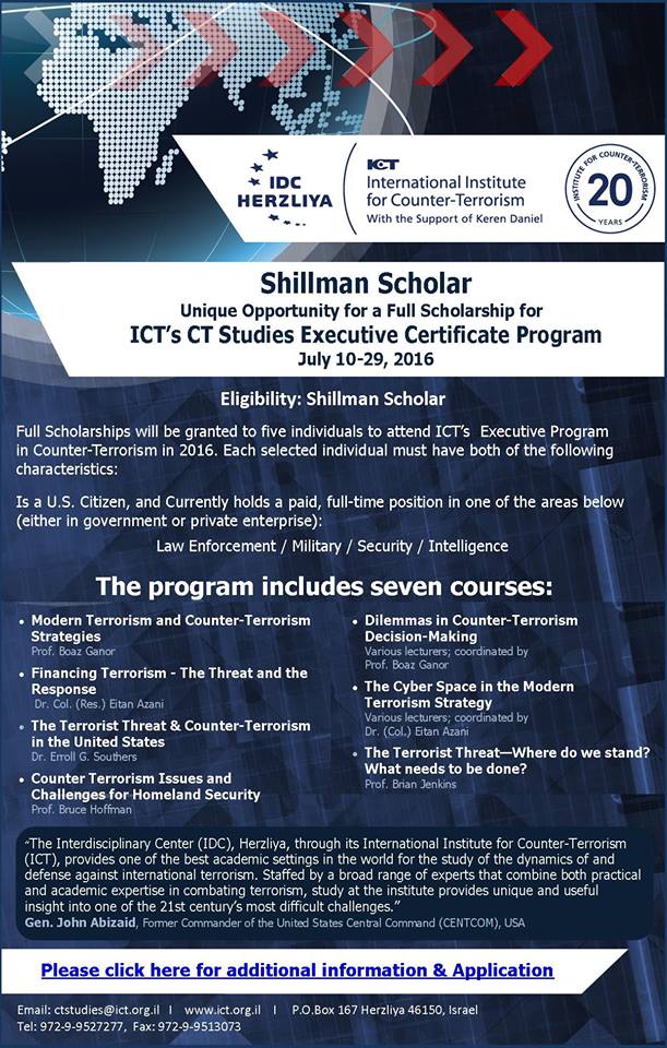 Unique Opportunity for a Full Scholarship for ICT's Executive Certificate Program in Counter-Terrorism Studies.pic.twitter.com/dSSQ67Zhjr