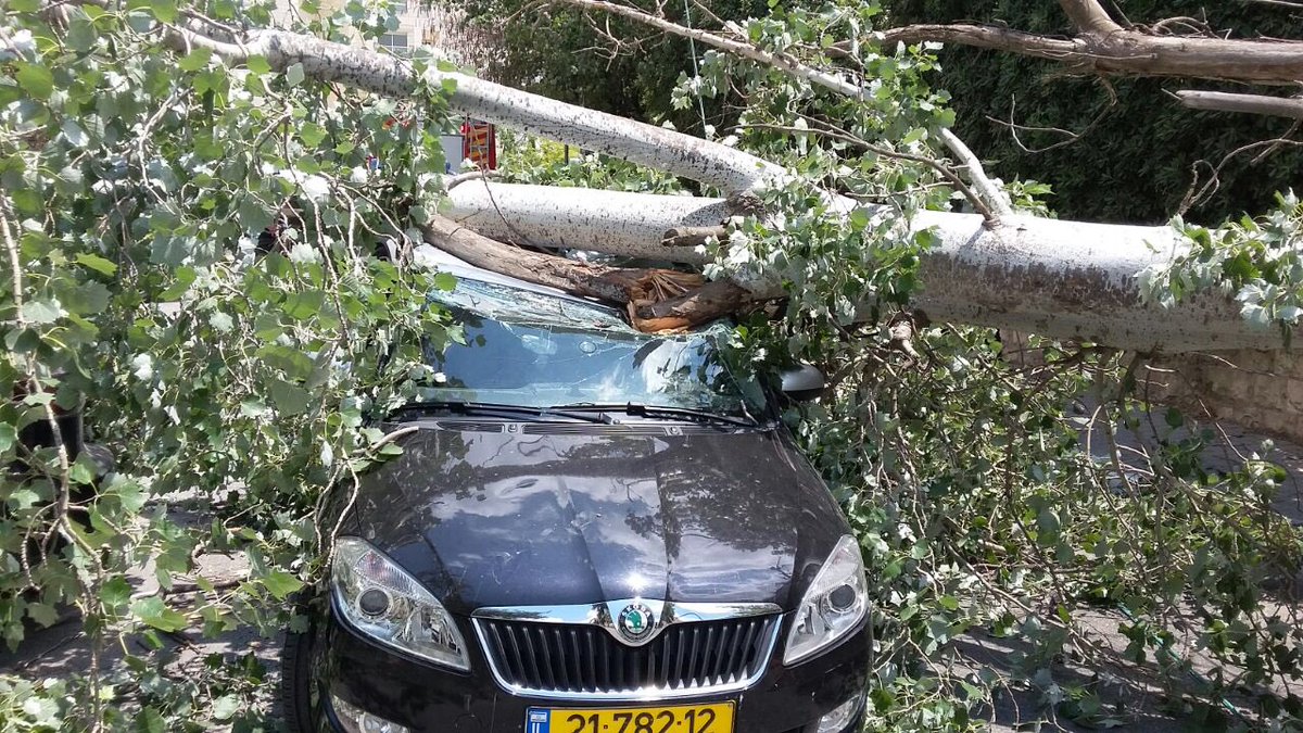 ברחוב אסתר המלכה בירושלים קרס עץ מהרוח ופגע ברכב. כבאים שהיו במקום בגלל עץ אחר. הספיקו להוציא את הנהגת לפני הפגיעה.pic.twitter.com/bnbuUgCnrL