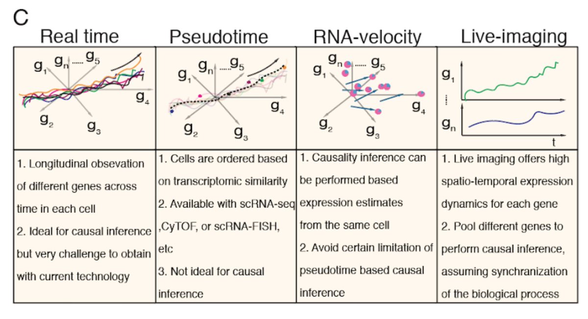 Towards inferring causal gene regulatory networks from single cell expression measurements - Haven't read this yet, but I like this summary of different notions of "transcriptomic time" in the supplement.