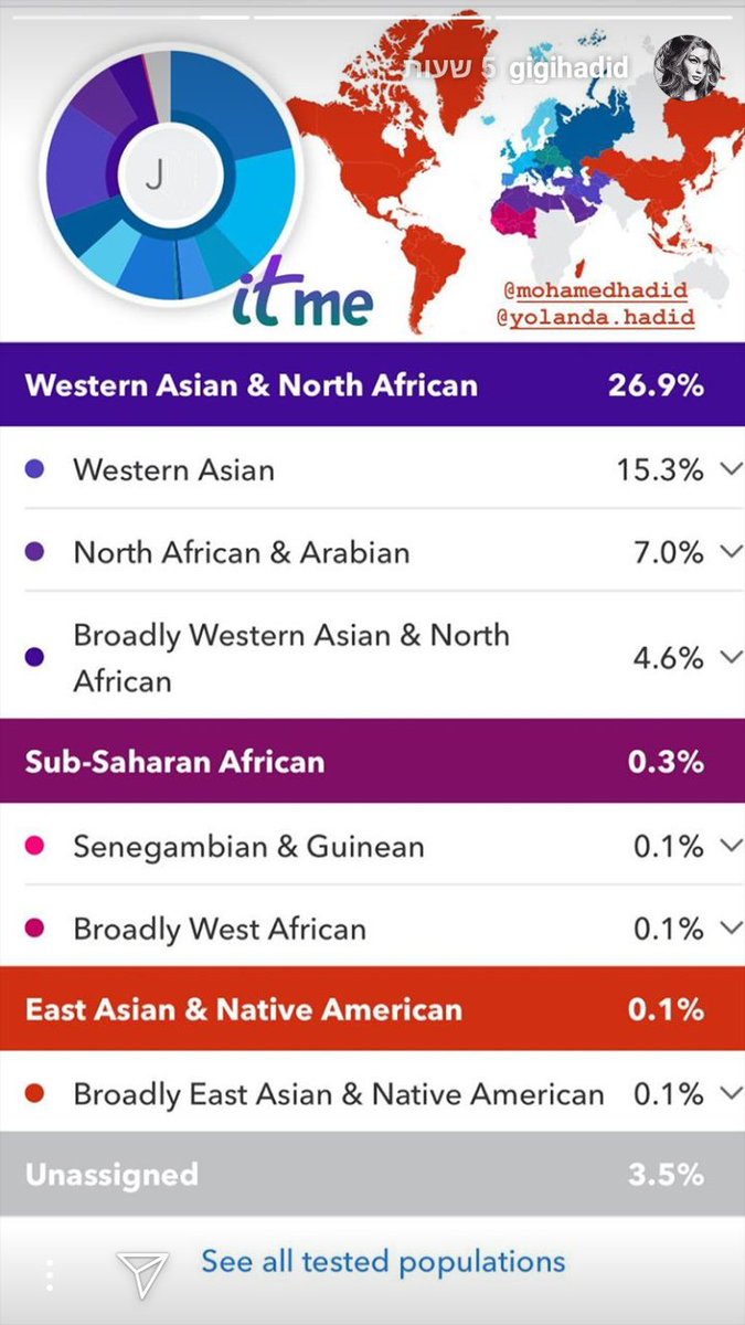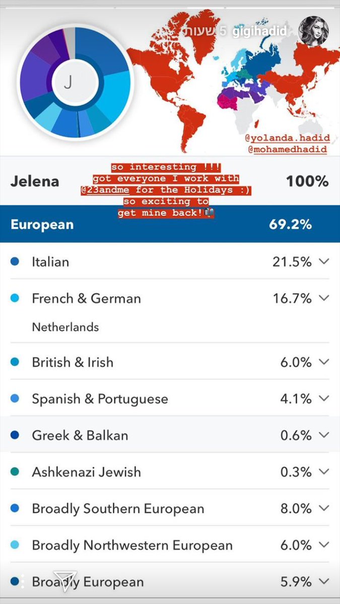 אז ג'יג'י חדיד שהיא כידוע חצי פלסטינית חצי הולנדית, עשתה בדיקות DNA ופרסמה את התוצאות באינסטה שלה. יצא לה שהיא 70% אירופאית, במקום הראשון איטלקיה 21%. יש אפילו 0.3% יהודיה-אשכנזיה